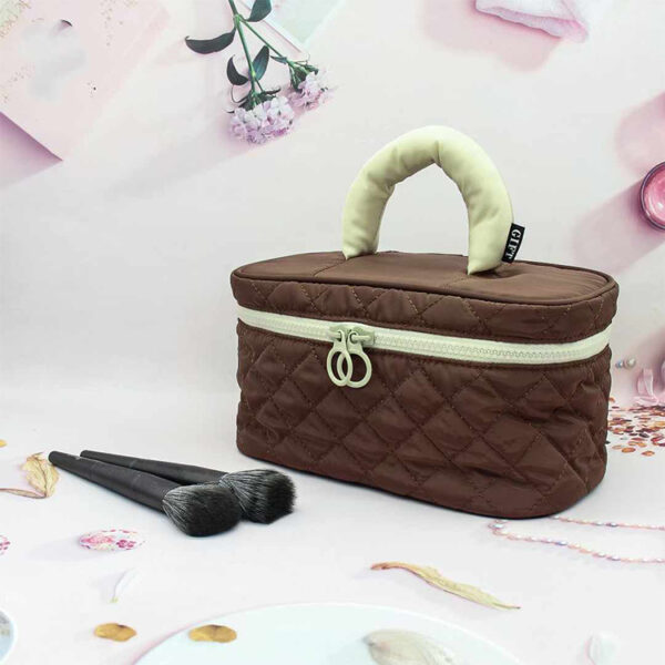 The custom women’s cotton quilted large-capacity floral cute travel cosmetic bag with handle provides ample space for all your beauty essentials while its charming floral design and convenient handle make it both stylish and easy to carry.
