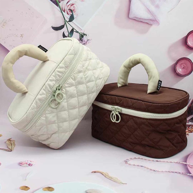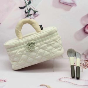 The custom women’s cotton quilted large-capacity floral cute travel cosmetic bag with handle provides ample space for all your beauty essentials while its charming floral design and convenient handle make it both stylish and easy to carry.